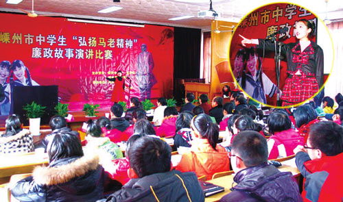 图为嵊州市举办中学生“弘扬马老精神”廉政故事演讲比赛。