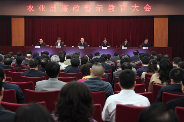 农业部党组副书记、副部长余欣荣出席会议并讲话。他指出,近年来农业部不断加大反腐败工作的力度,采取了一系列措施遏制和防范腐败,但违纪违法案件仍然时有发生。要善于从各种各样的违纪违法案件和消极腐败现象中,找到产生问题的根源,厘清发生问题的原因,总结应当记取的教训,以案为鉴、以案说纪,发挥好查办案件、查处问题的最大作用。要把严以修身作为领导干部的基本功,坚定理想信念,坚定走中国特色社会主义道路的信心,坚守共产党人的精神追求。要把严以用权贯彻在日常工作之中,坚持权为民所用,利为民所谋。始终把握住对权力的行使进行严格制约和监督这个最重要的环节,始终坚持按规则和制度行使权力,把权力关进制度的笼子里。